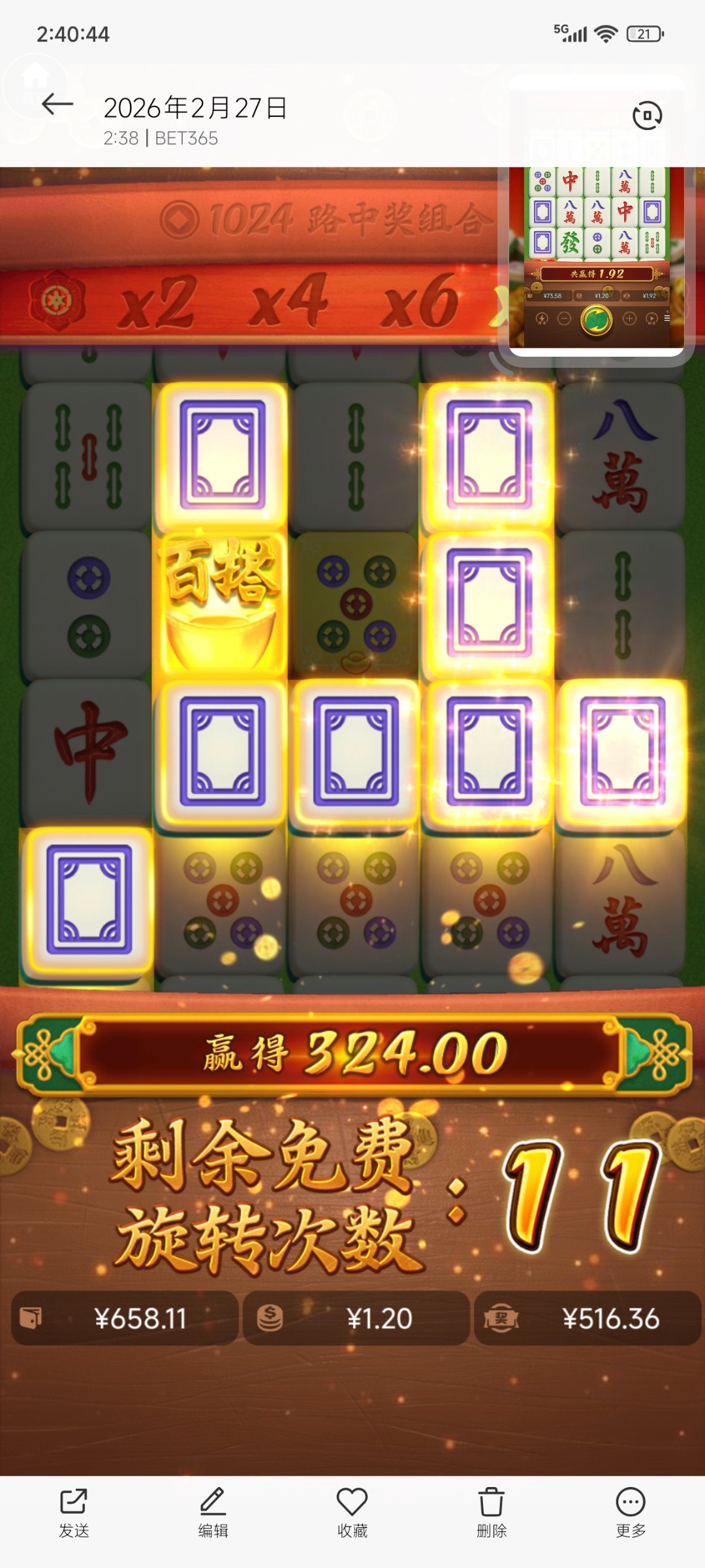 最后剩下两块进胡 400杯 昨天开4块的时候,最高40倍都没有(1000块直接吃完)