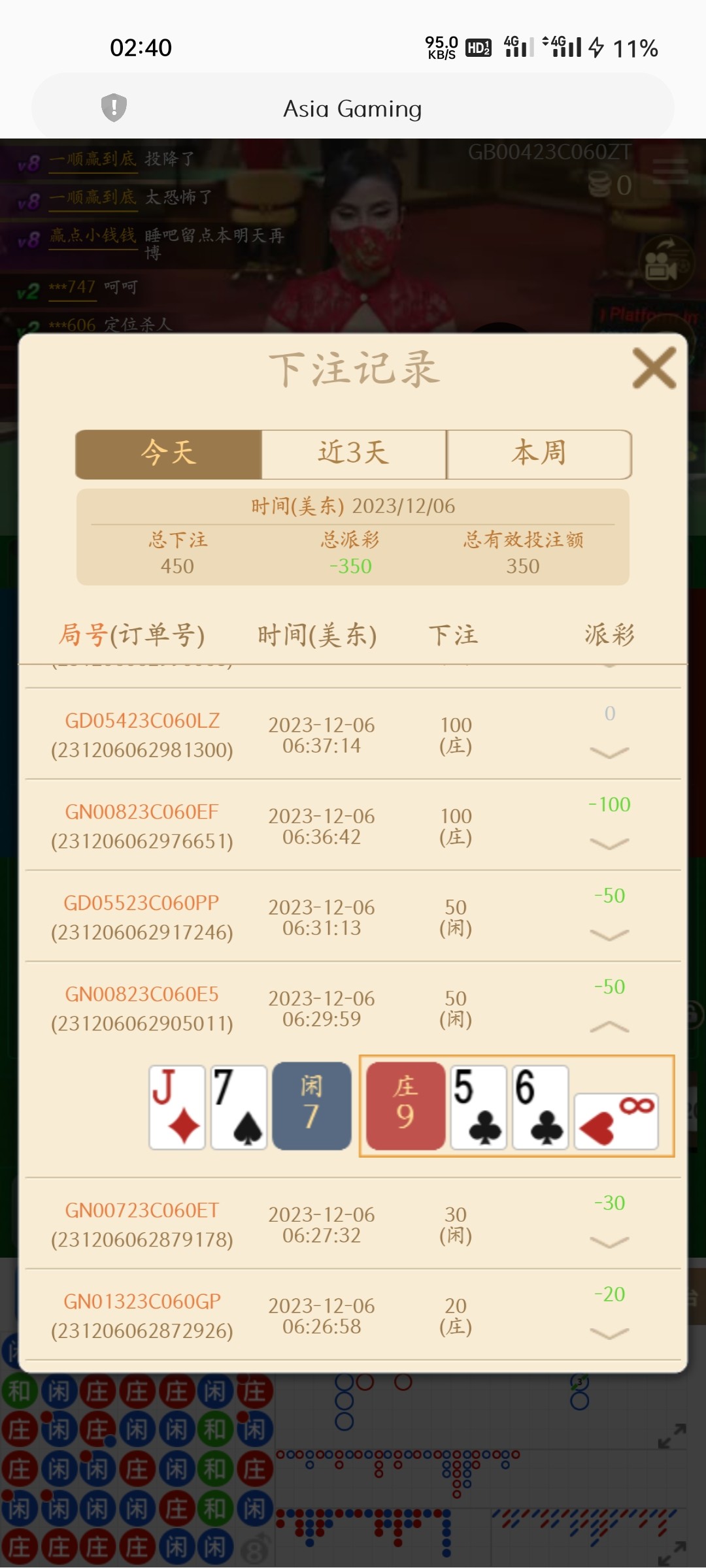 我下了7把注,对面5把都是9点,一把和,还有一把点杀对面6点我5点,吃相真难看