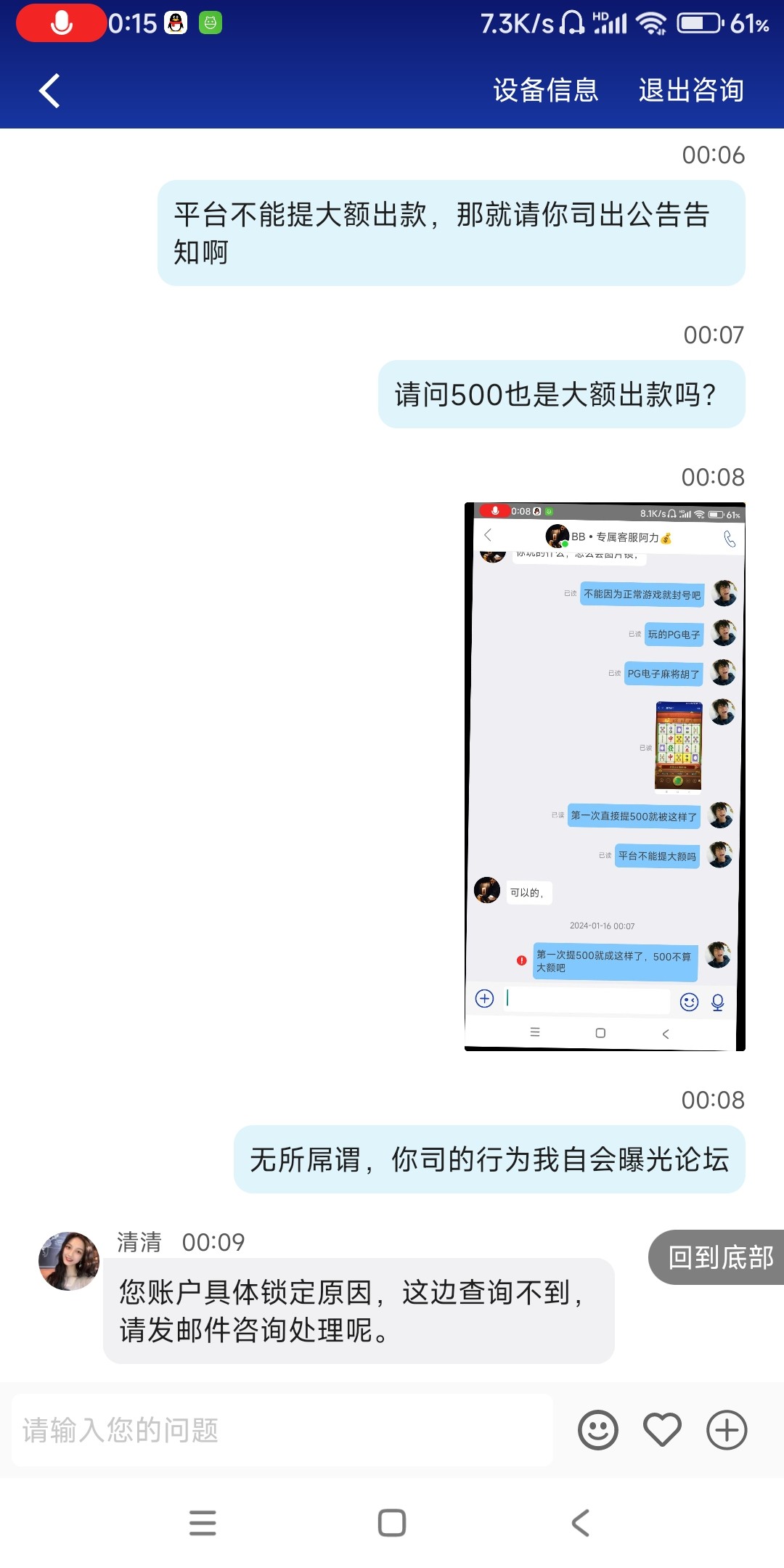 BB体育手持台避坑,VIP3老用户,之前是分批次出款到账,这次第一次直接提500直接封禁,小额能出大额必封台,开香槟