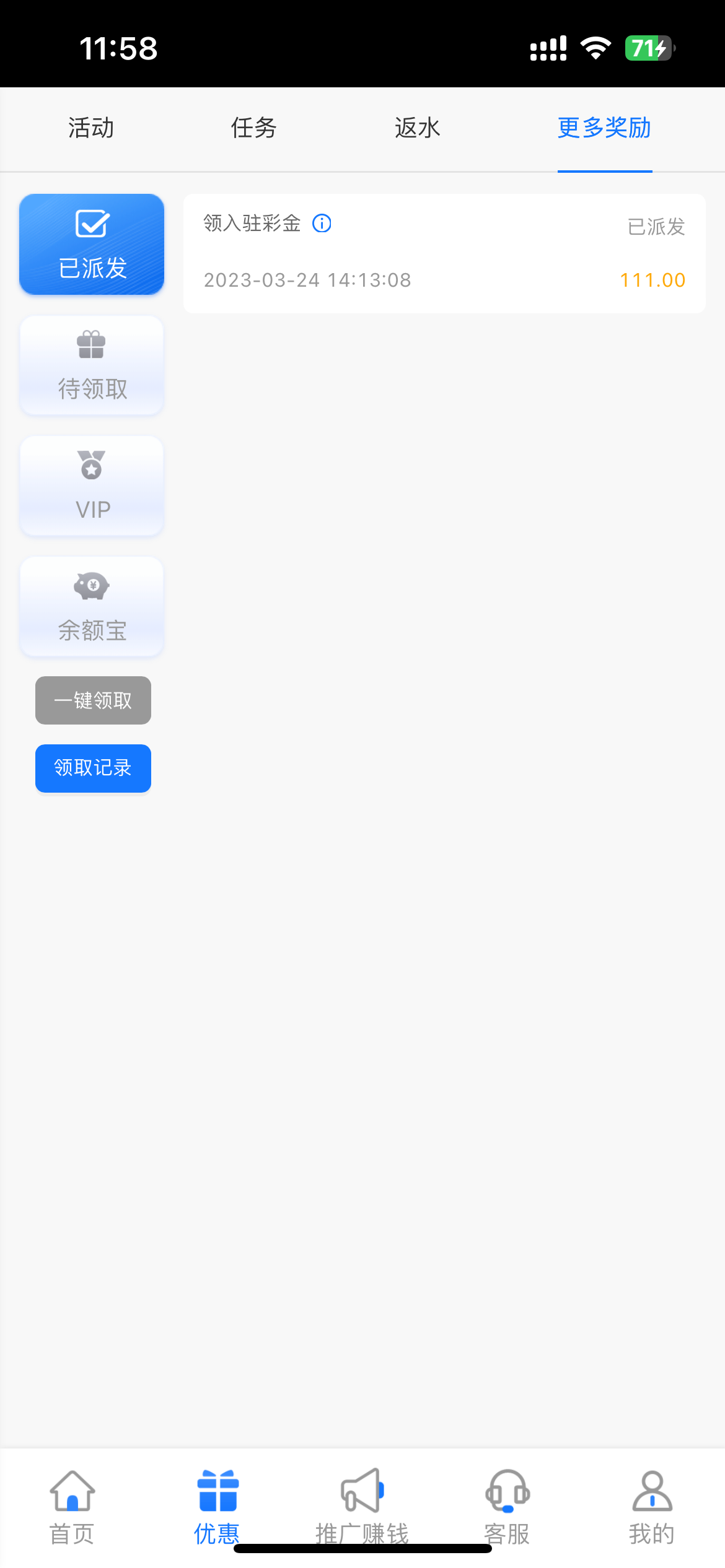 你们都是大佬 我就一个v4的号 一万多流水 昨天发的 今天下午送了38入驻彩金 提了120到账