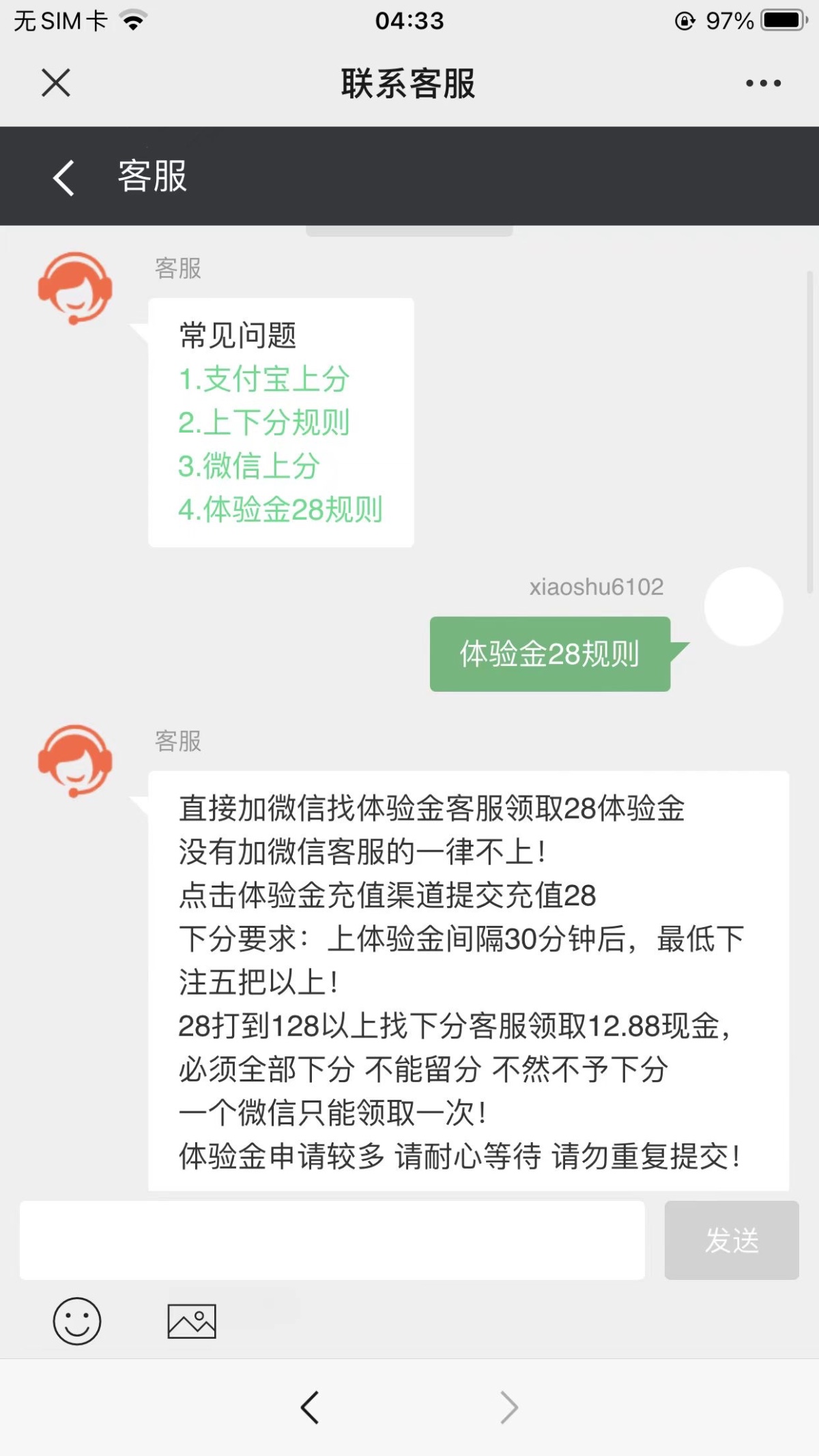 注册账号登陆联系客服添加微信体验金客服发ID,充值里提交28体验金,28打到128可以下12.88,最少下注5期