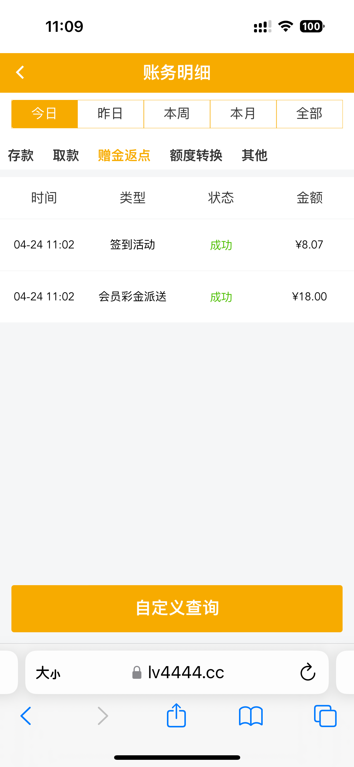 老台子了 一般都注册过 登录有回馈 签到领取8彩金我打出来了