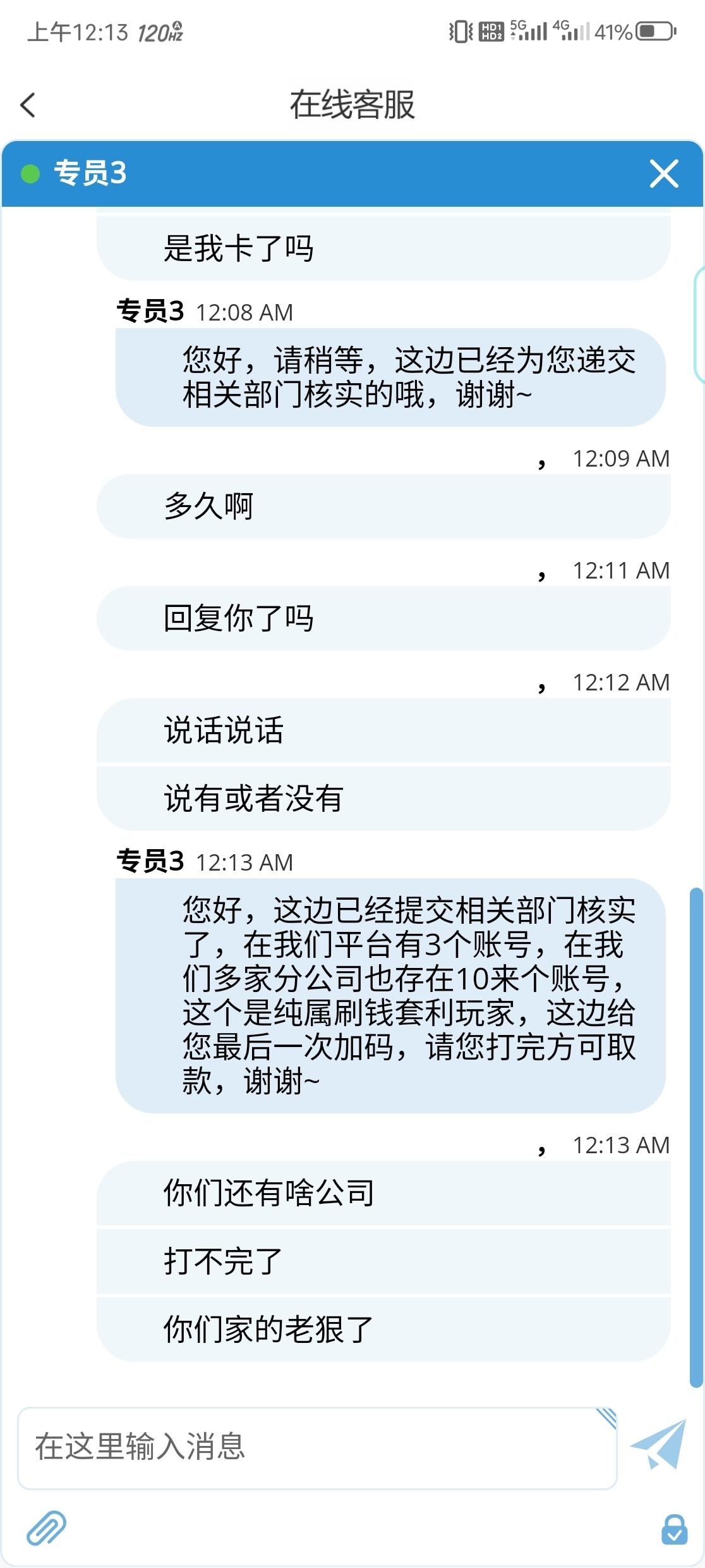 特邀彩金36打到百八,提现说只让提275,余额充值100打五杯水。然后提了275退回了,说只让提200,余额充一百八杯水提现,然后我冲了100,打够流水提现,第一次说取款后未在线,加了两万流水,打够了提现第二次说我多账号加了五万,第二次打够了,第三次说我在他们平台其他公司也有账号卤菜的,又加了五万,说是最后一次加流水,这次打完给提,然后我打完了去提,又加了5w流水。。。而且只能玩wg电子,明着黑,反正已经十几万的流水