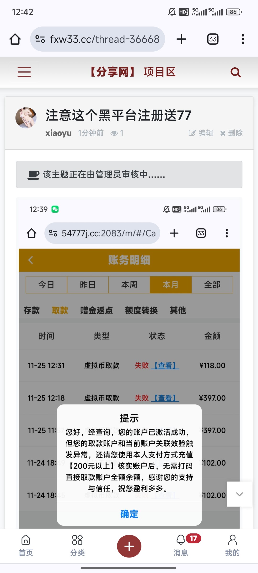 黑平台就是一直骗,提现100需要充值100,然后流水打够了不给提,又需要充值200,提款397也不给提,反正就是一直这样黑,各位大哥注意