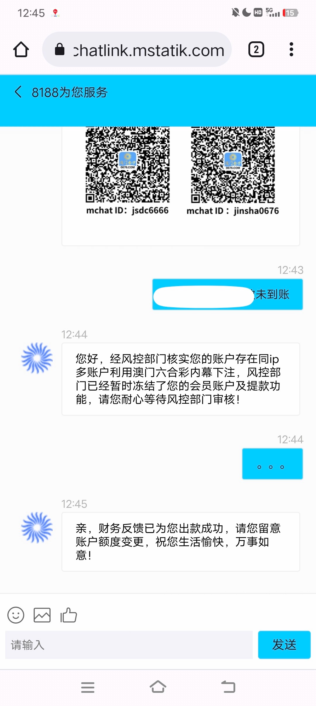 我就一个号  第一句搞个什麽多ip  后来我发了个点点.. 我还准备说的 我他妈就一个号 还是充值用户  结果客服又自动回我已出款成功 吓死我了