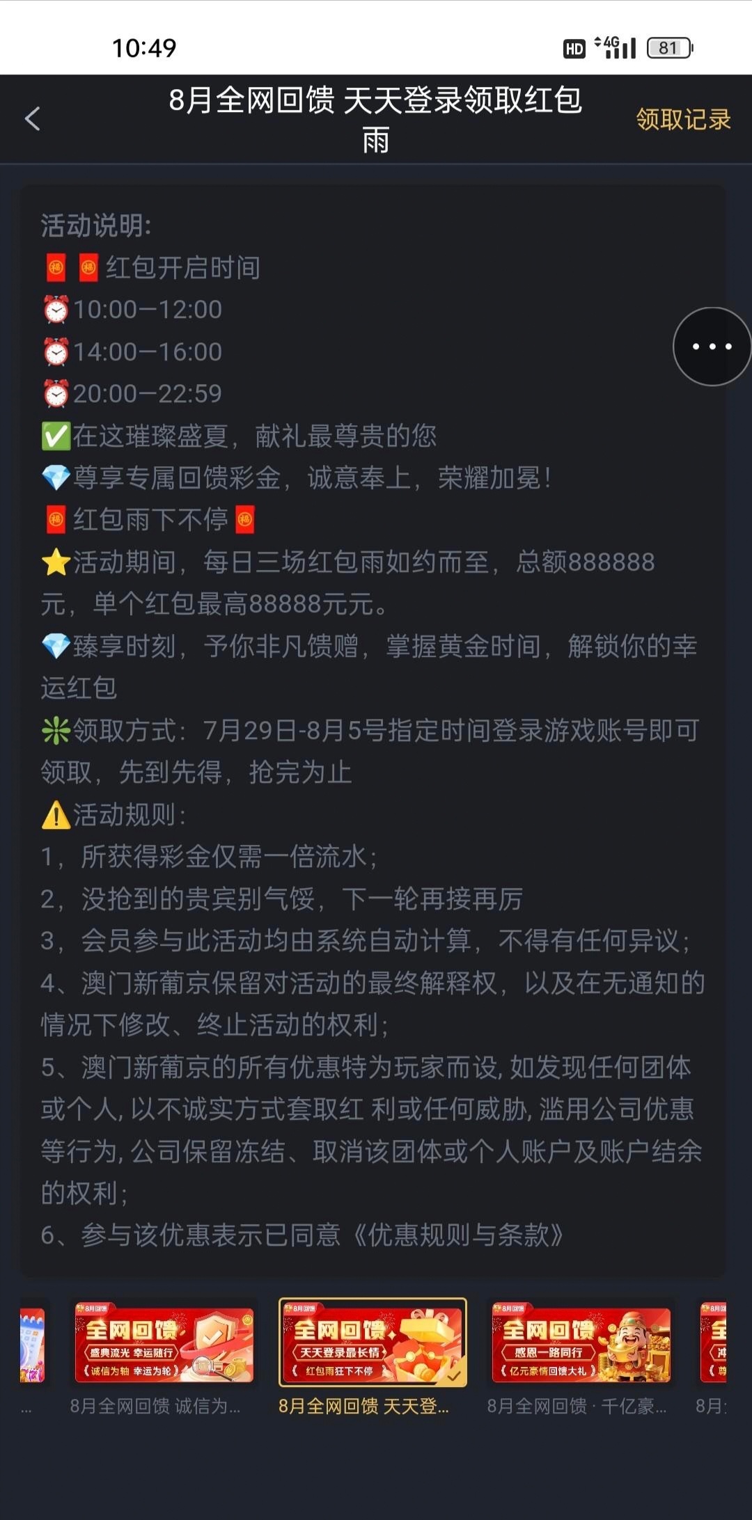 有历史充值的,8月5号之前,每天三次免费抢红包,三次加起来有20块左右,出款自测。