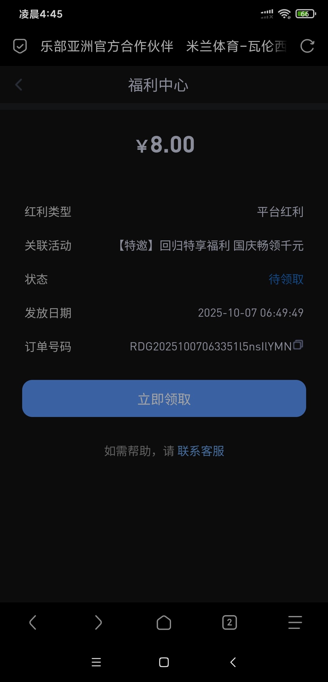 收到站内信了,V0给了8块,找在线客服发【金秋十月】。