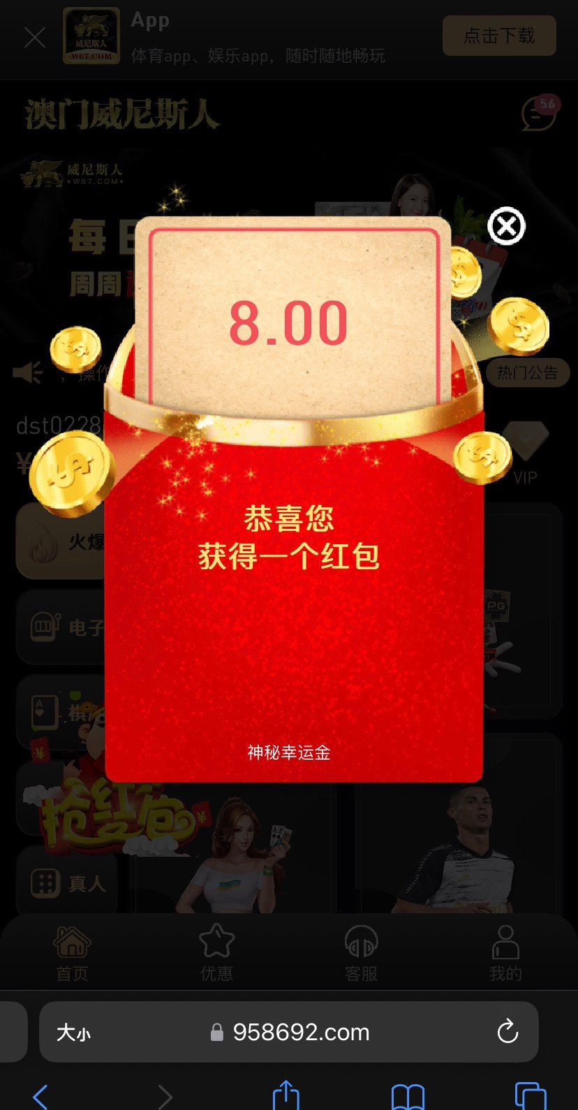 威尼斯人w67 神秘彩金 我领了八块 有号的可以去看看