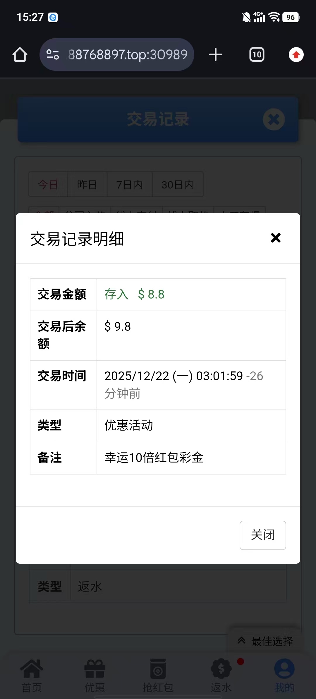 这个平台是最垃圾平台充值10次输10次,100块钱都很难赢,红包每次几毛钱,抢10倍红包的全是0.88,连1.88都没有一个,这个平台不建议充值玩