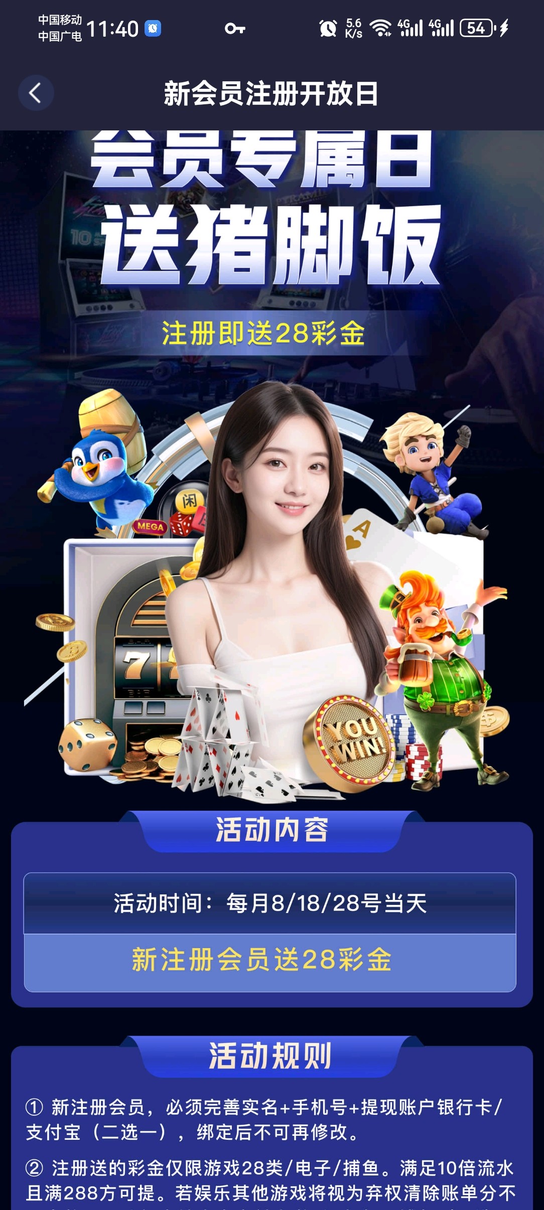今天会员日注册送28,打满288以上可全提,不限制电子,出款自测。
