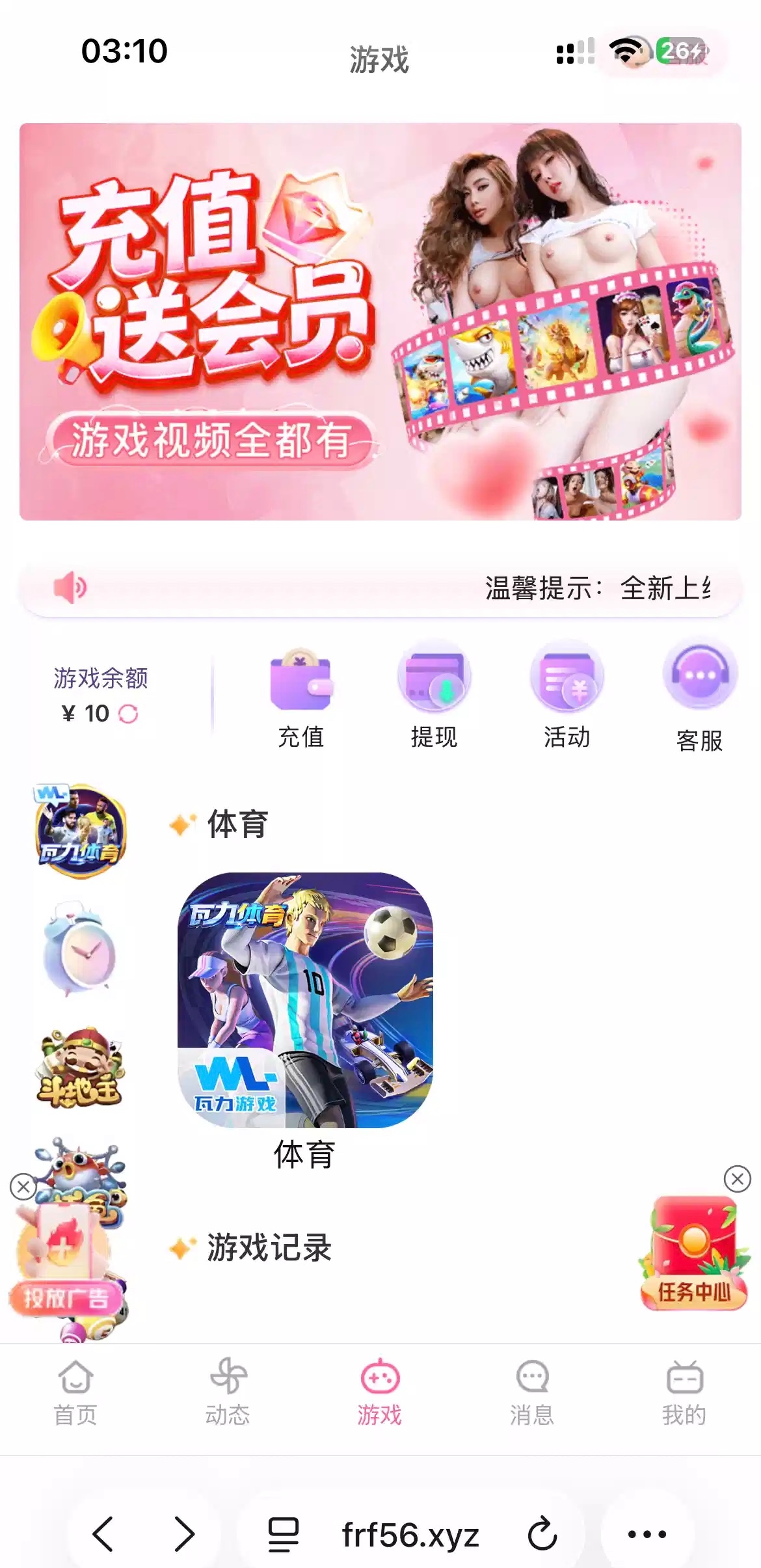 刷广告看见的 打开点游戏 然后注册送了10块 里面只有开元和瓦利游戏 我没打不出来不知道能不能出 赌神上 网址: