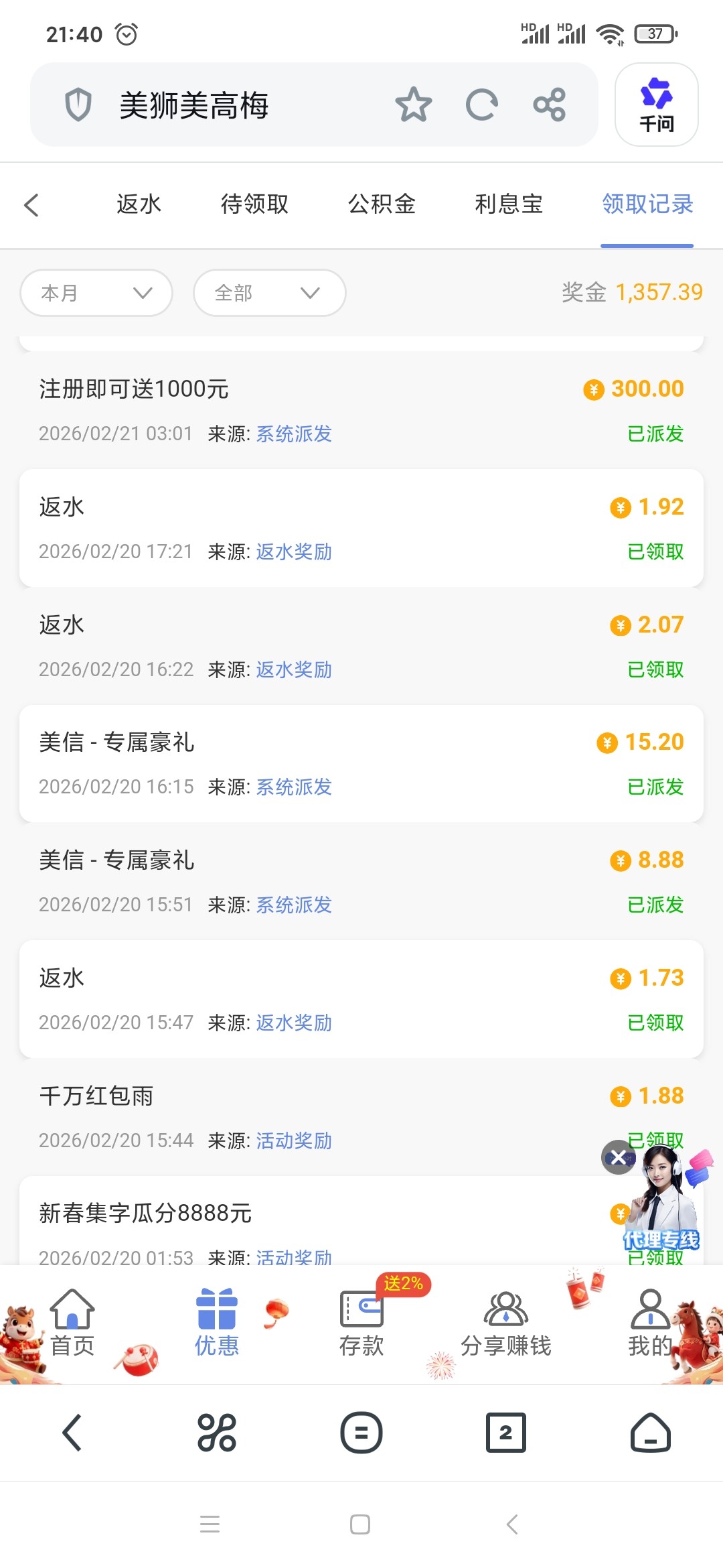 刚刚狗庄财务给我打电话来,说进去有彩金回访,这个台子之前充值了100,他喵的毛都没提出来,今天看来狗庄良心发现了,给我送来春节彩金回馈,官网美高梅https://www.45.lc  打不开就换这个56893.cc  防止拦截,还有个备用网址02.TT,18彩金看我撸死狗庄财务搞个500出来他奶奶的