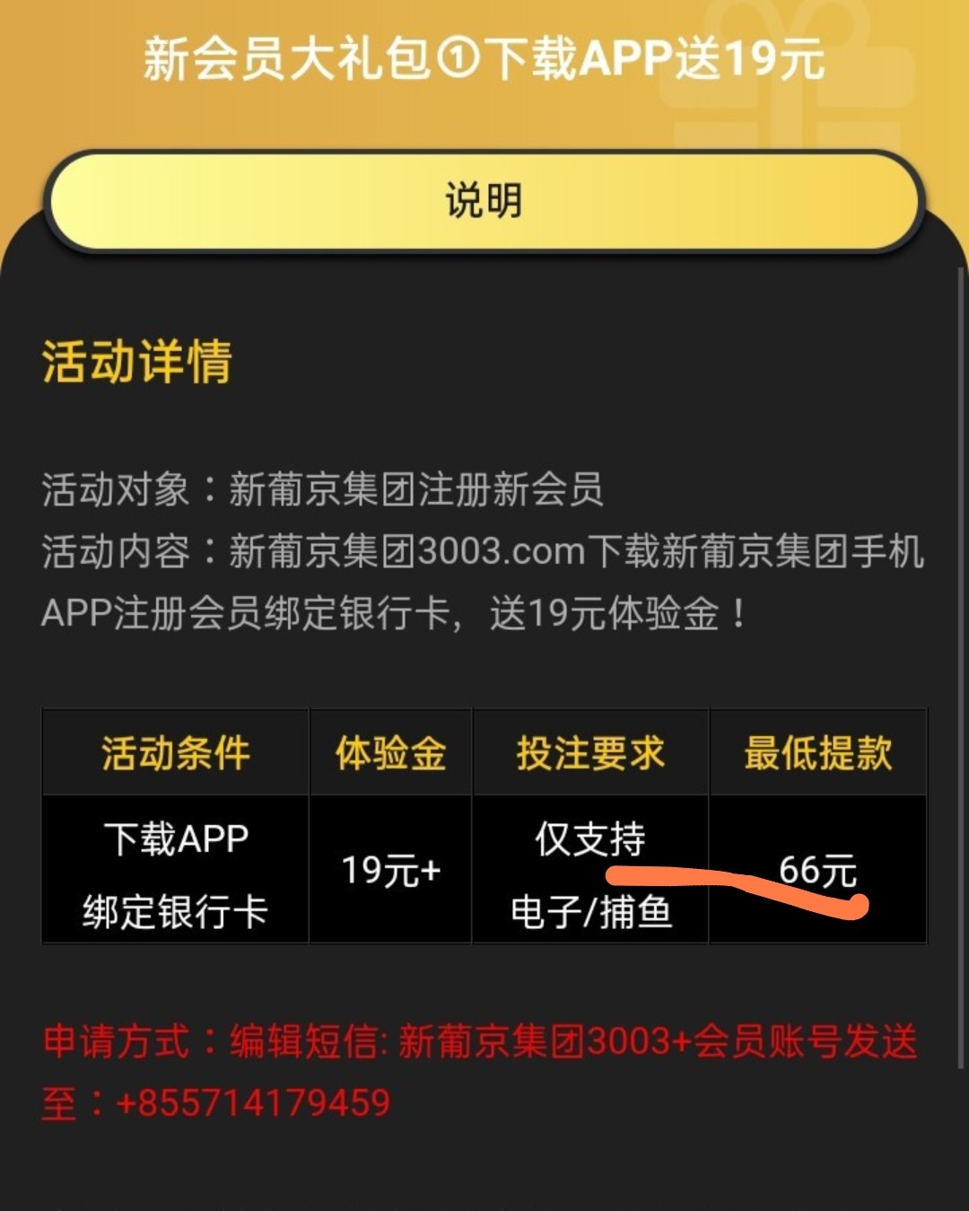 新用户注册绑卡活动页面自助发短信申请19,满66即可提款 。