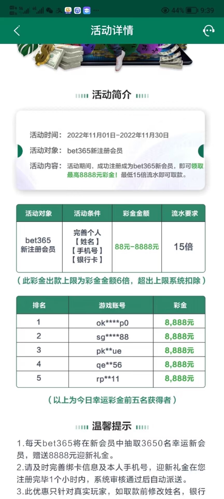 来自网友投稿:注册绑卡两分钟自动派送88彩金最多半个小时15倍流水游戏无限制没送的咨询客服易黄 没送就是没抽到,不符合,具体看活动